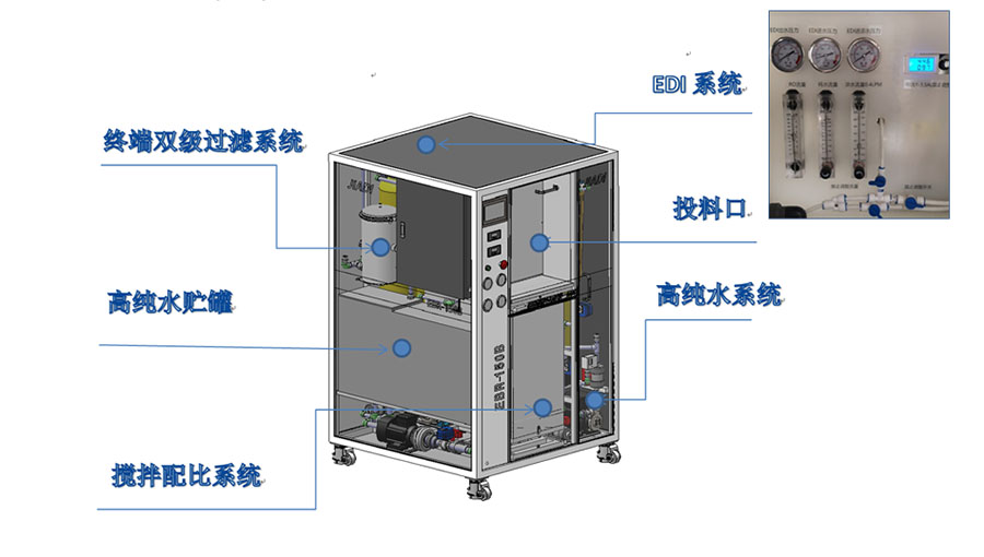 EBR150E内置EDI膜堆、EDI电源、EDIl水箱和水泵以及整套控制系统,配合双级反渗透可以连续生产15MΩ.cm超纯水。